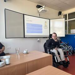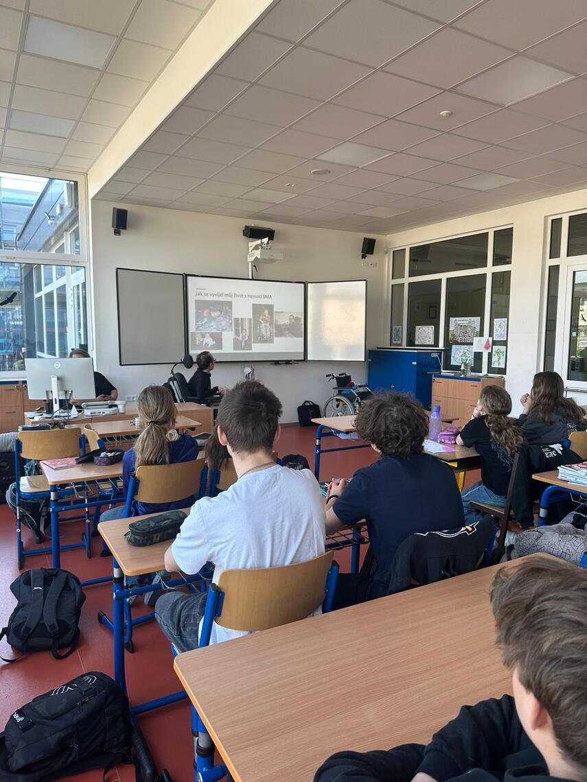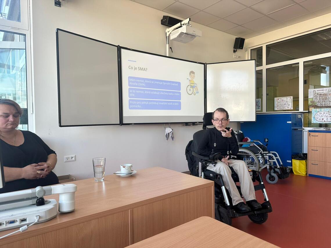 V úterý 13. května měli žáci 7. B výjimečnou příležitost setkat se s panem Adamem Kratochvílem, který je upoután na invalidní vozík a ochotně sdílel svůj životní příběh, každodenní zkušenosti i své postoje k překážkám, které život s tělesným znevýhodněním přináší.
