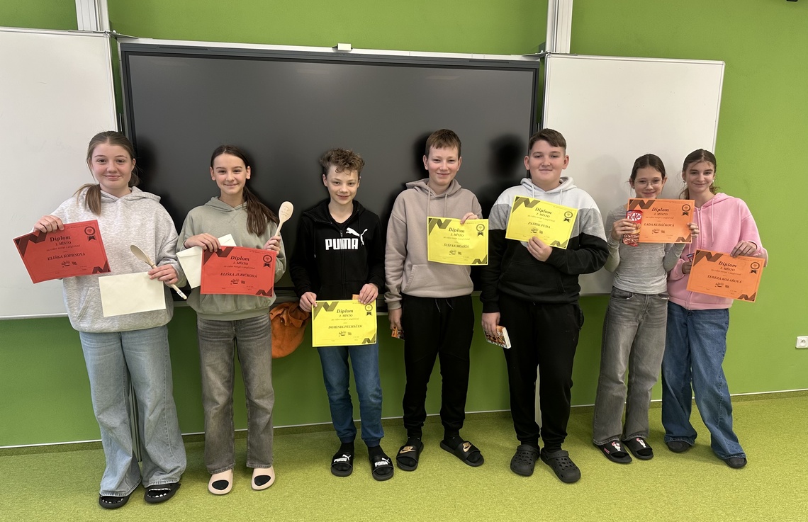 V průběhu měsíce listopadu měli žáci 7. tříd možnost zapojit se do soutěže, ve které si mohli ověřit nejen své znalosti angličtiny, ale také jak jim to jde s kamerou a jak zdatní jsou kuchaři. Jejich úkolem bylo samostatně, ve dvojicích či trojicích natočit video recept a doprovodit jej komentářem postupu v angličtině. Se zadáním si poradili na jedničku a zaslouží si velkou pochvalu za svou originalitu, vtip, zručnost i jazykovou úroveň. Ve vysoké konkurenci bylo těžké vybrat vítěze, nakonec však na 3. místě skončily Lada Kubáčková a Tereza Kolářová, na 2. místě se umístili Dominik Pecháček, Patrik Puda a Štěpán Mojžíš a 1. místo obsadily Eliška Koprnová a Eliška Juričková. Když jsme si jejich videa pouštěli ve třídě, všem se nám sbíhaly sliny Věříme, že je práce s kamerou bavila, a těšíme se, až budeme zase v angličtině probírat téma vhodné k natočení.