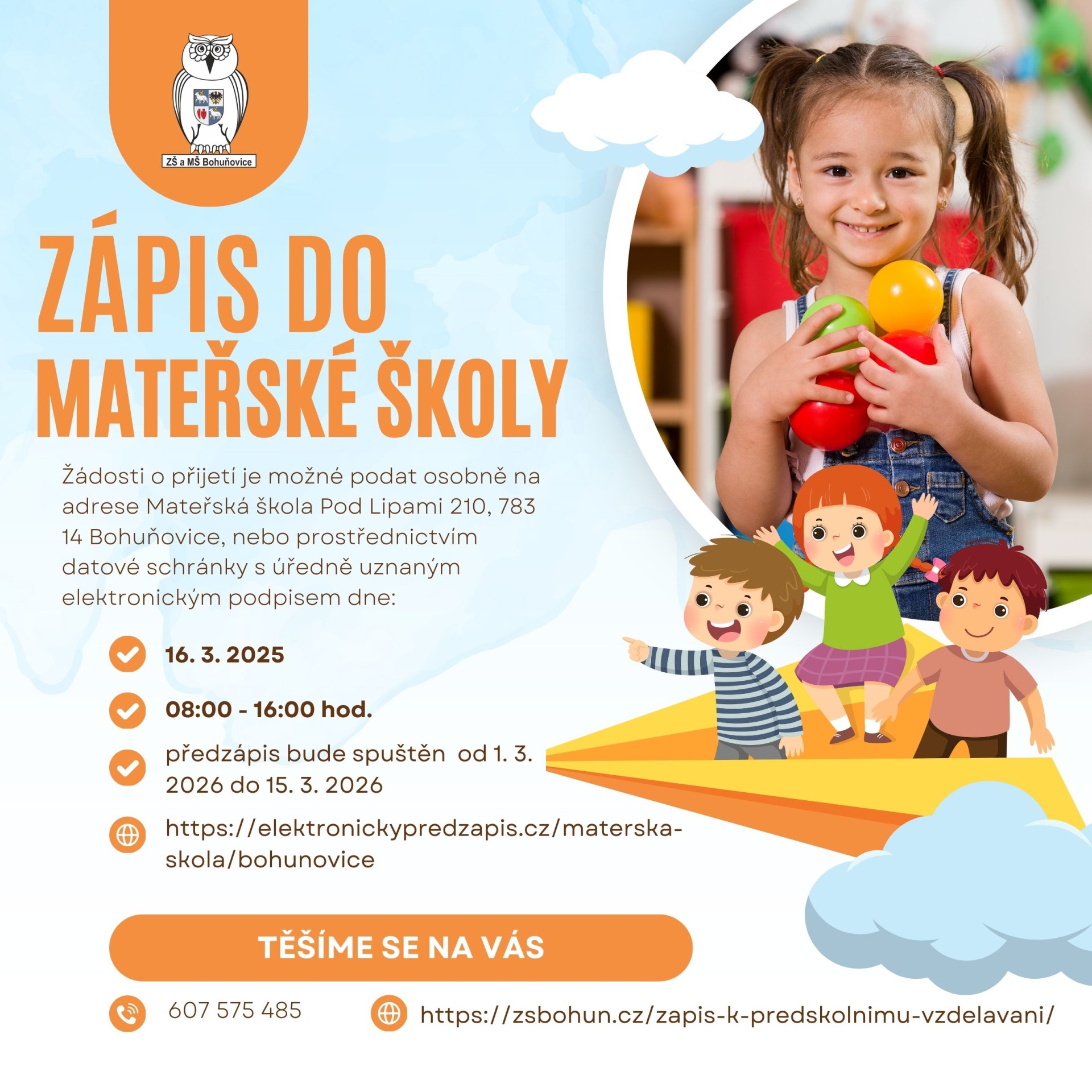 Elektronický předzápis bude probíhat od 1. 3. – 15. 3. 2026 https://elektronickypredzapis.cz/materska-skola/bohunovice
