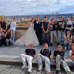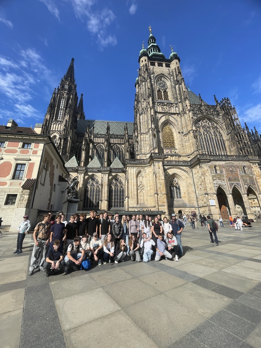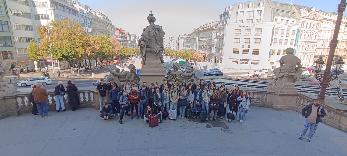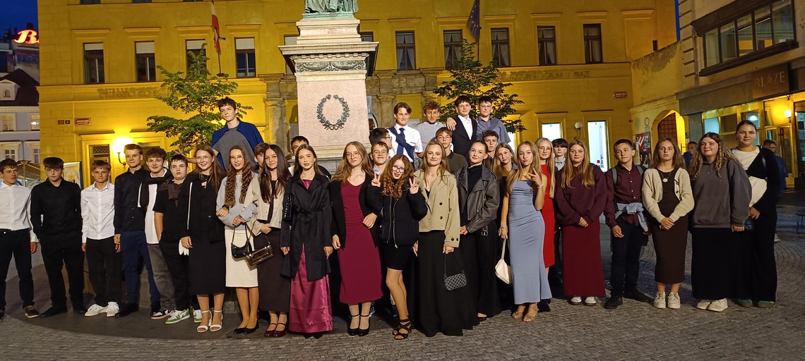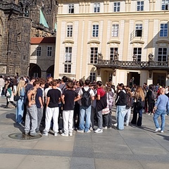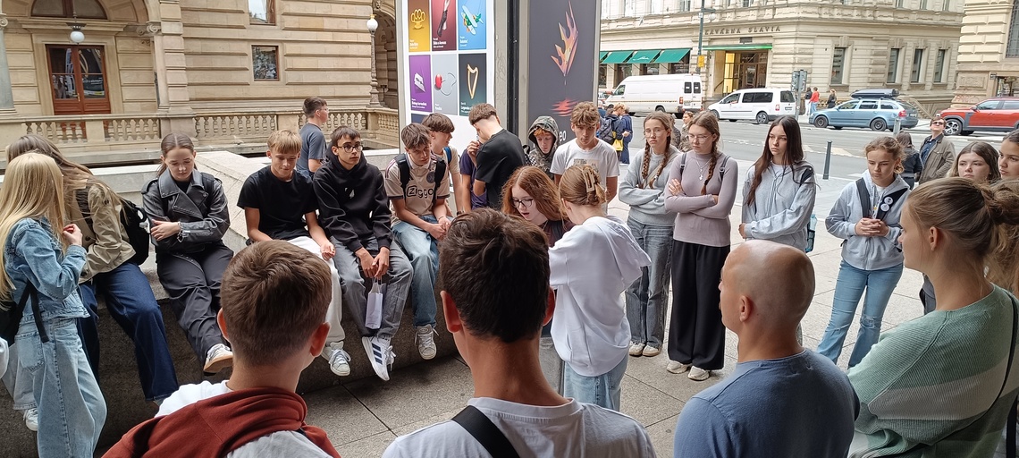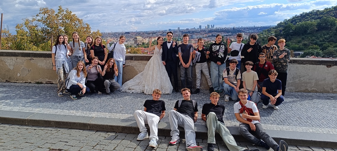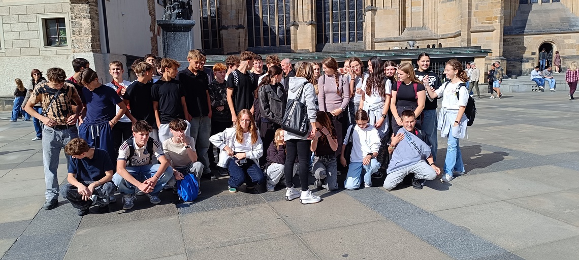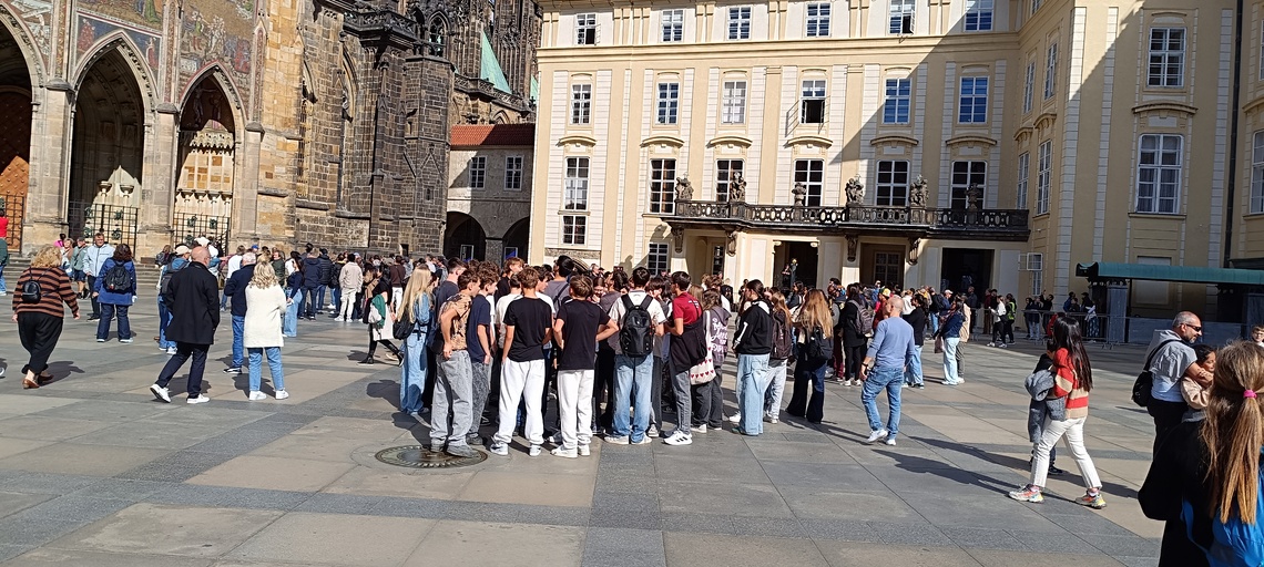 Poté začíná pěší exkurze v tradičním směru Stará Praha – Pražský hrad – Karlův most – Národní divadlo – Národní třída – Václavské náměstí. Během zastávek máme dopředu rozdělené referáty ke konkrétním místům – památkám, objektům. Dozvídáme, jak získala Zlatá ulička svůj název, jak vysoká je katedrála sv. Víta apod. Bohužel se nestihneme zastavit na prohlídce korunovačních klenotů (fronta na 1,5 hodiny). Ale zato máme společné foto s novomanželským párem z Hong-Kongu na Hradčanském náměstí.